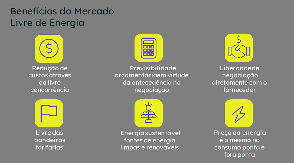 O Mercado Livre de Energia é um ambiente de compra e venda de energia elétrica, no qual os consumidores escolhem o próprio fornecedor e negociam preço, prazo, volume e forma de pagamento diretamente com as geradoras ou comercializadoras. Esse mercado também é chamado de Ambiente de Contratação Livre (ACL).